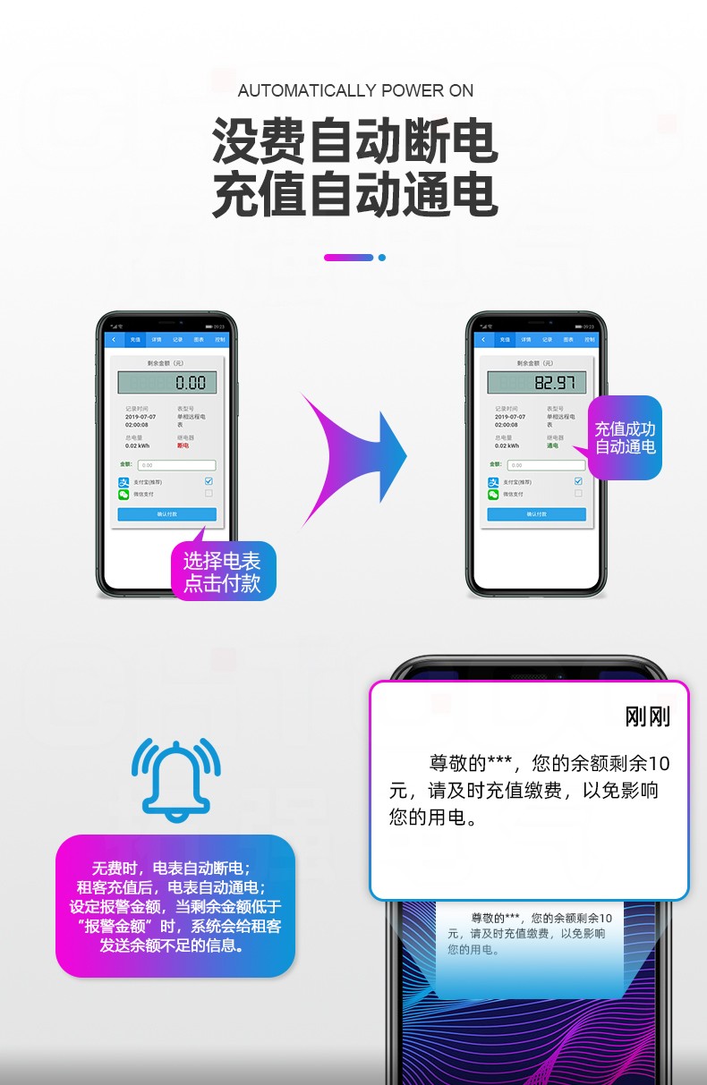 拉合閘功能 | 無費(fèi)自動(dòng)斷電,充值后自動(dòng)通電,手動(dòng)遠(yuǎn)程控制通斷電 |