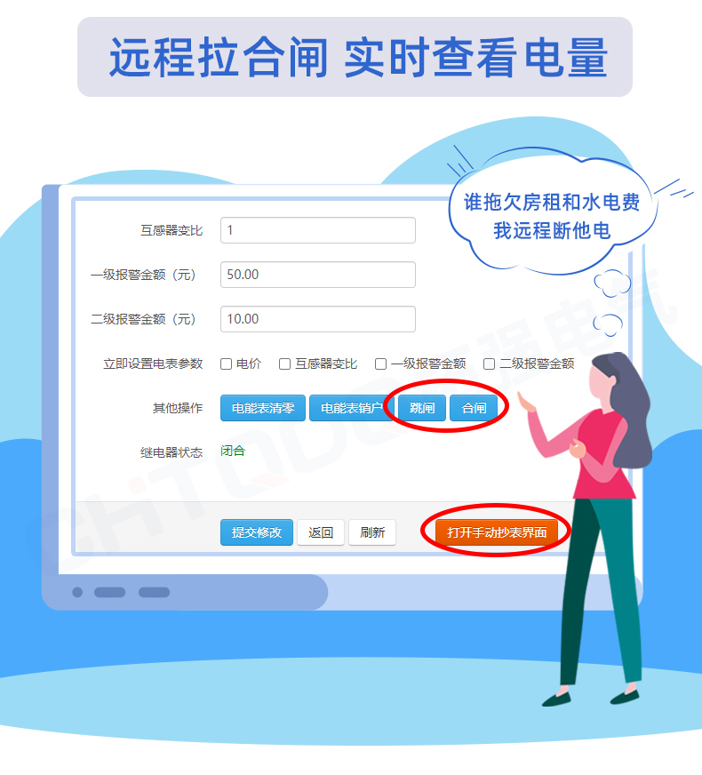 拉合閘功能 | 無(wú)費(fèi)自動(dòng)斷電,充值后自動(dòng)通電,手動(dòng)遠(yuǎn)程控制通斷電 |