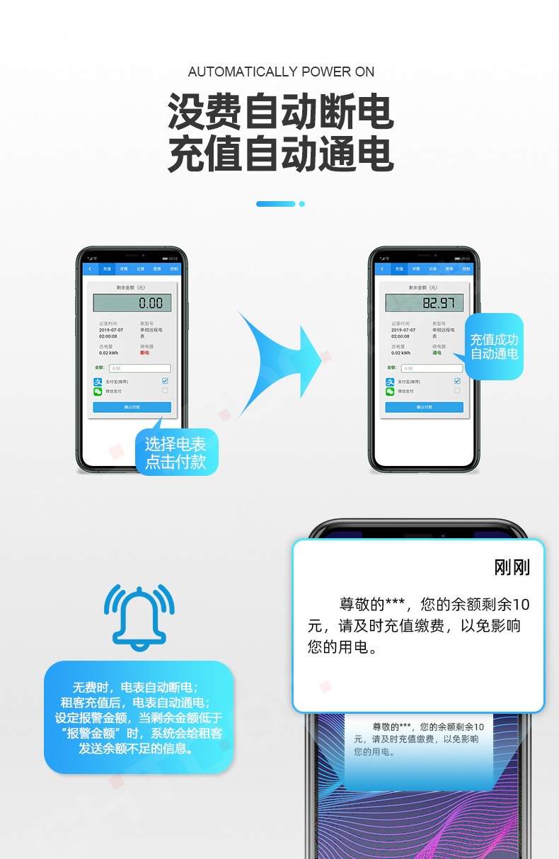 拉合閘功能 | 無費自動斷電,充值后自動通電,手動遠(yuǎn)程控制通斷電 |
