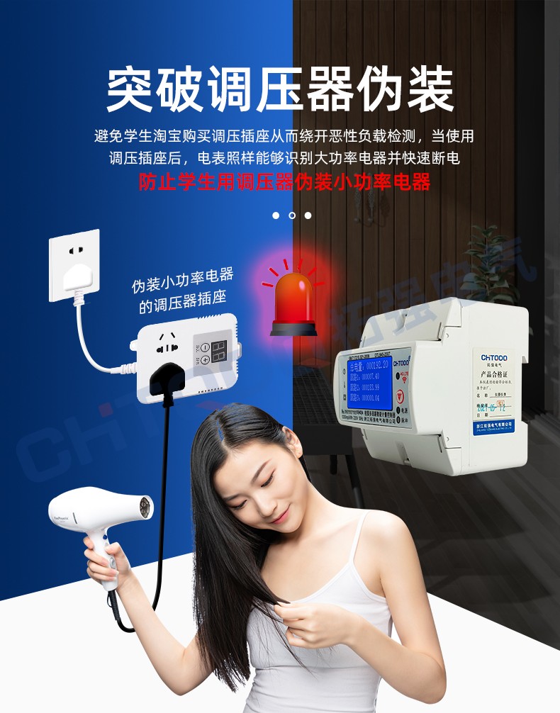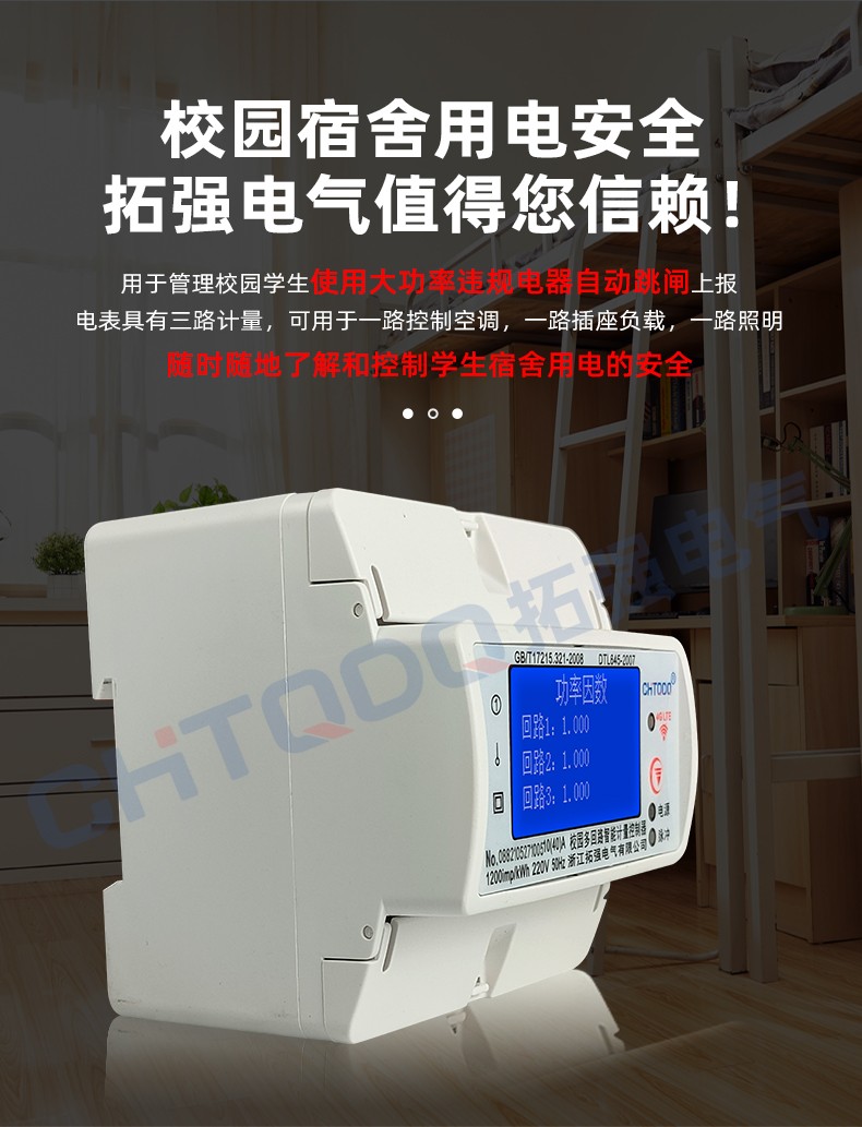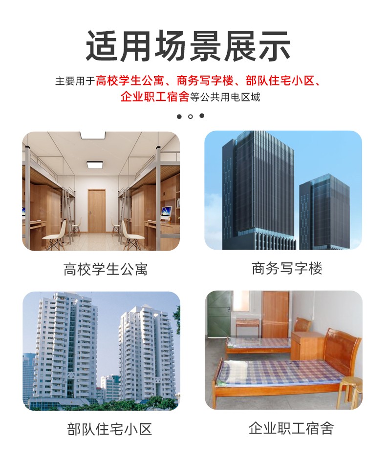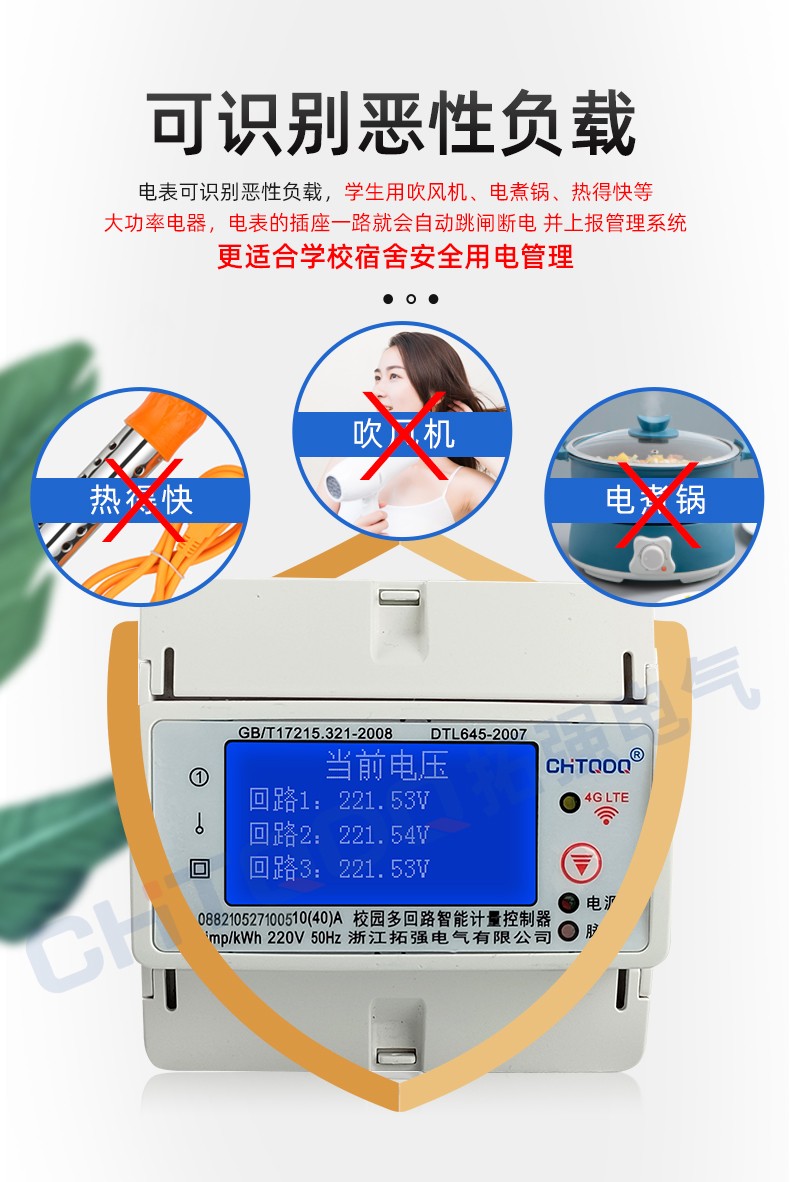 電表可識別大功率電器,當(dāng)學(xué)生使用熱得快,電飯鍋,夾發(fā)棒,熱水壺等大功率電器時,電表自動斷電并上報(bào)記錄到管理系統(tǒng)后臺。
