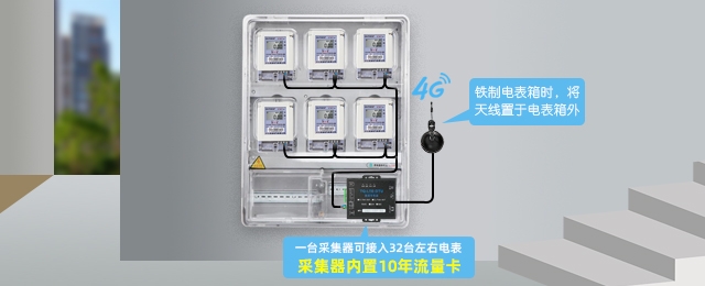 電表用485線(xiàn)連接采集器,電表集中安裝到一個(gè)電箱時(shí)使用,采集器送10年4G流量